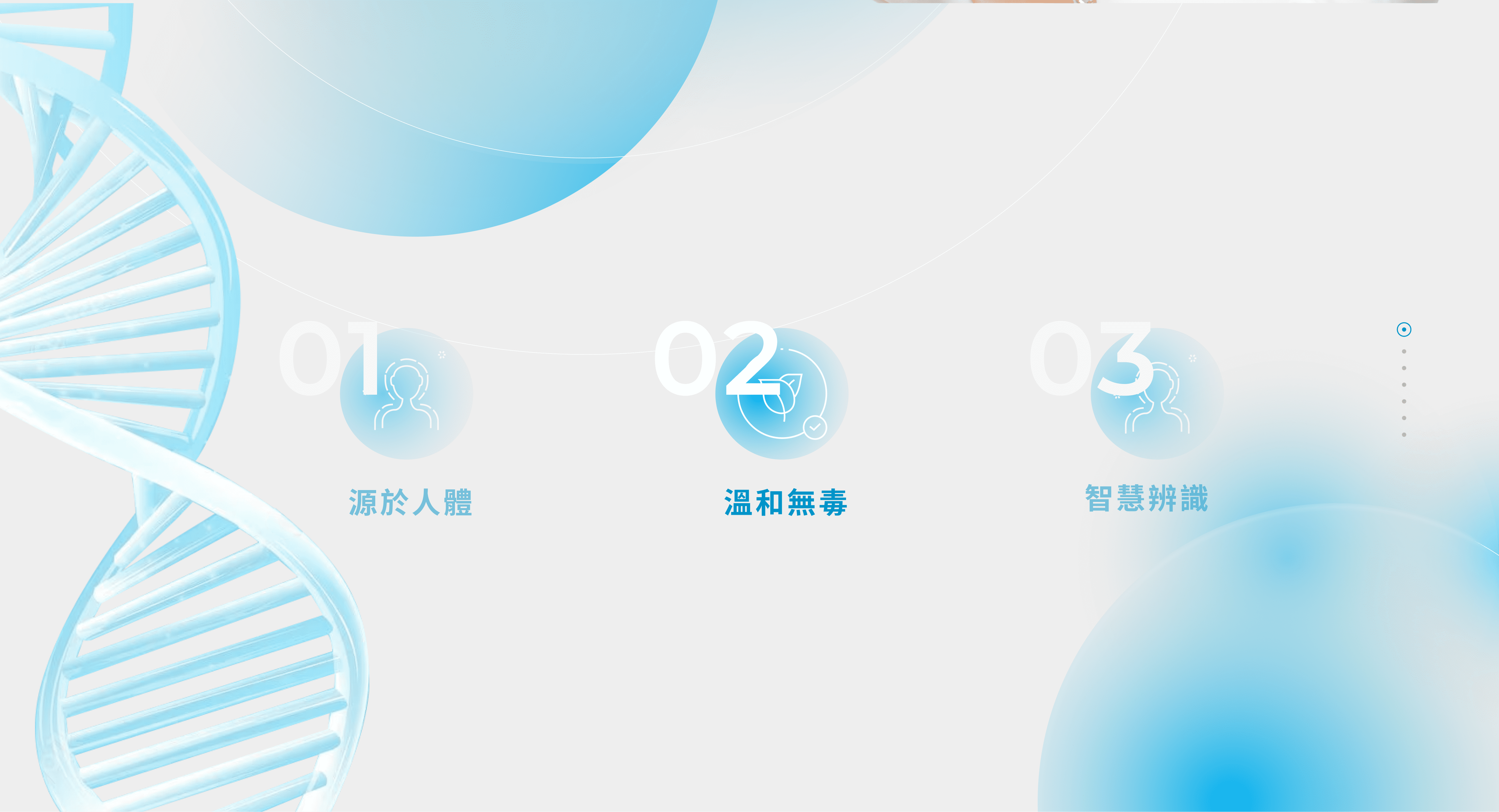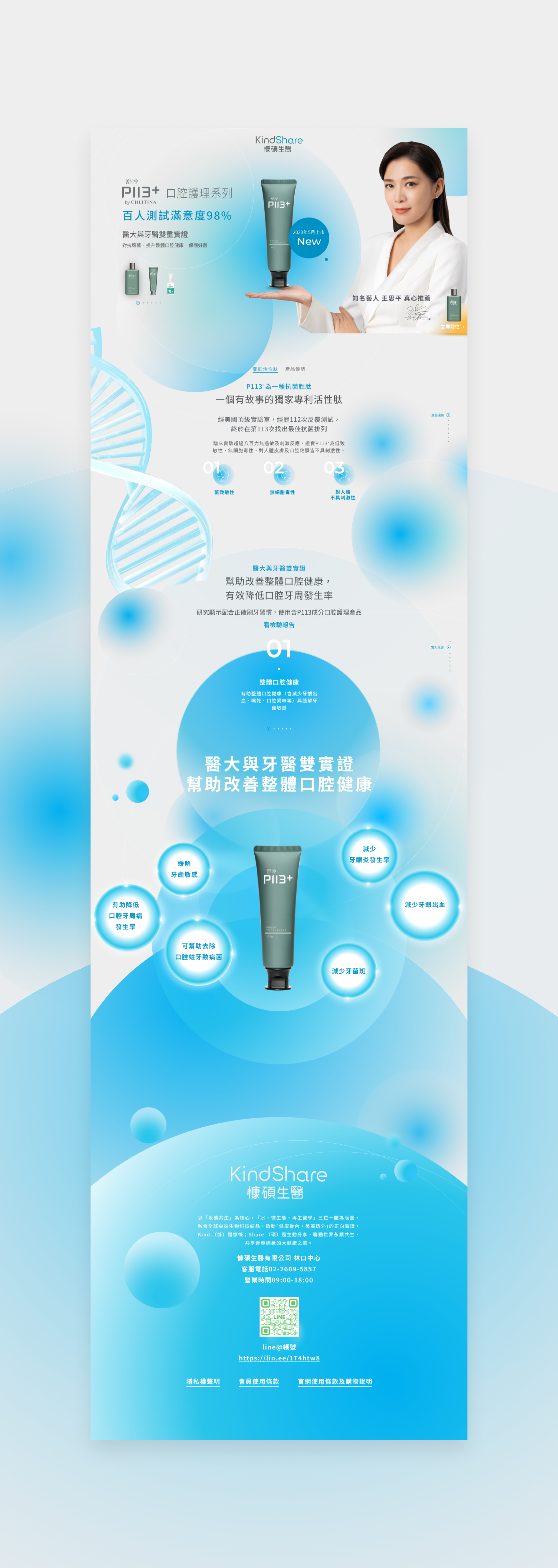 慷碩經臨床實驗超過八百力無過敏及刺激反應,證實P113⁺為低致敏性、無細胞毒性、對人體皮膚及口腔粘膜皆不具刺激性。 白質設計在視覺上以溫和泡泡為設計軸心,將舒緩與涼感結合,運用淡藍色系與產品包裝建立舒服的對比。並將手機與電腦版本區劃,電腦版本以品牌形象作為主軸;手機版負責促進消費行為。