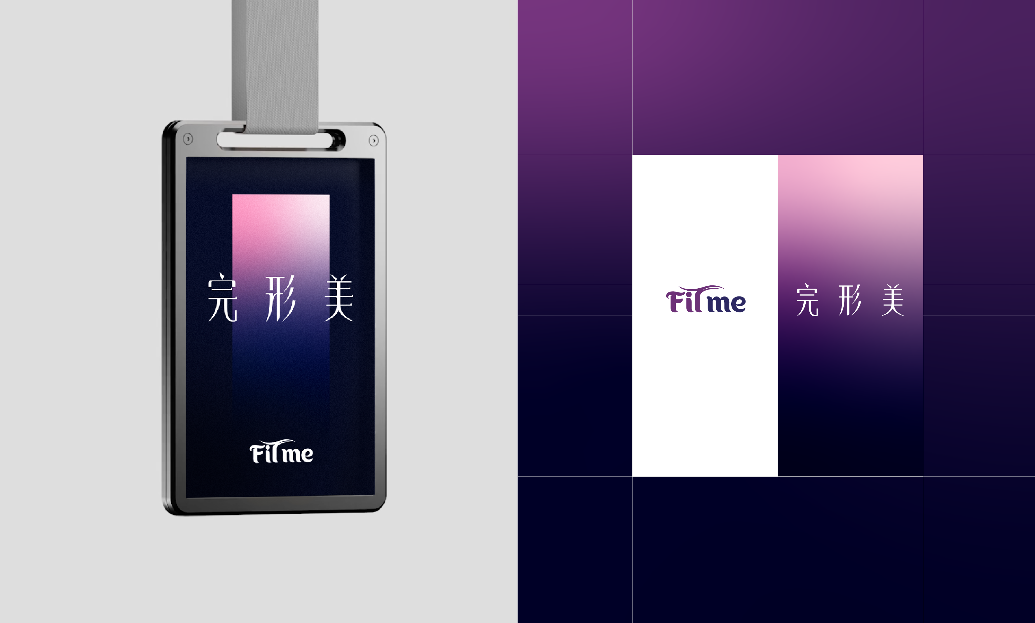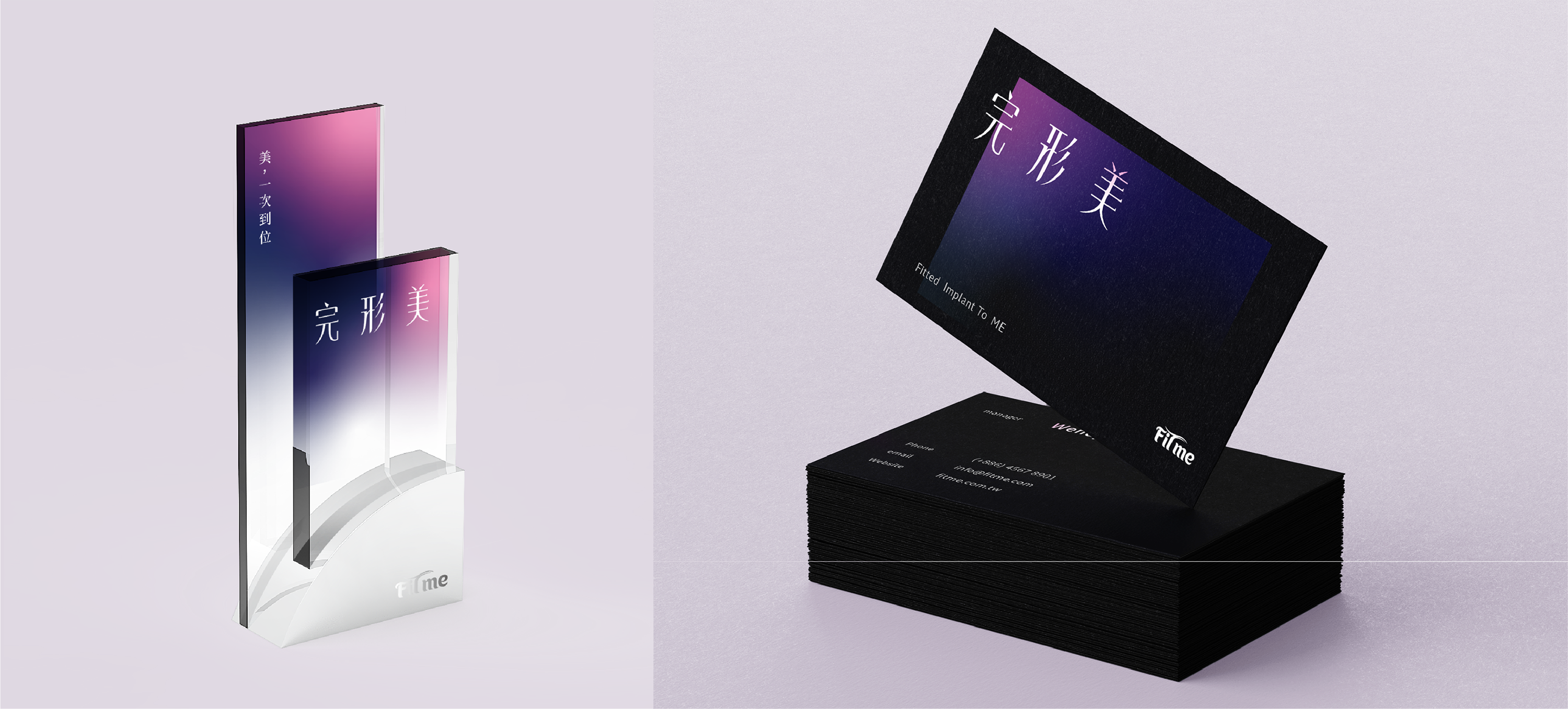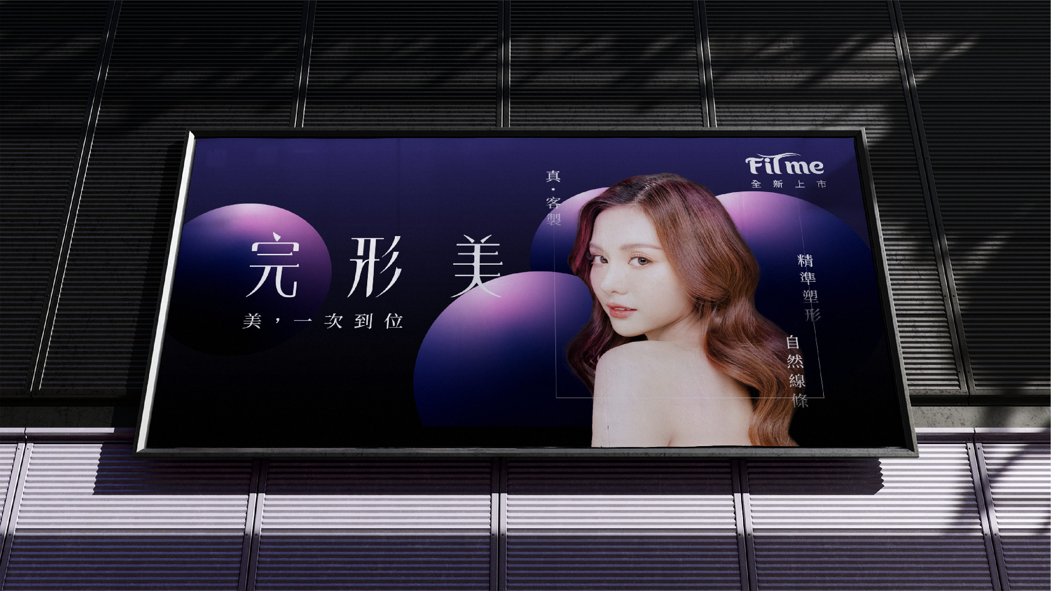 理解Fitme的科研技術背景基礎,以及品牌致力於透過卓越3D科技推動醫美植體的進步,以精準的手術流程,補全患者的缺陷。 我們結合完形的概念與Fitme的讀音,將完形變為完美的過程。於是品牌在地命名為『完形美』。 基於全新的概念思維,品牌提出全新標語『美,一次到位』。完形美不僅補全患者缺陷,同時也打造出與同業差異的品質關鍵。 品牌的形象設計同時加入的優美曲線與科技質感,高挑優雅的字體滿足患者對完美的想像,低調奢華的科技感在完形美的文化中不斷擴散,科技與時尚並存的魅力姿態,確保完形美在臉部植體的技術領導地位。