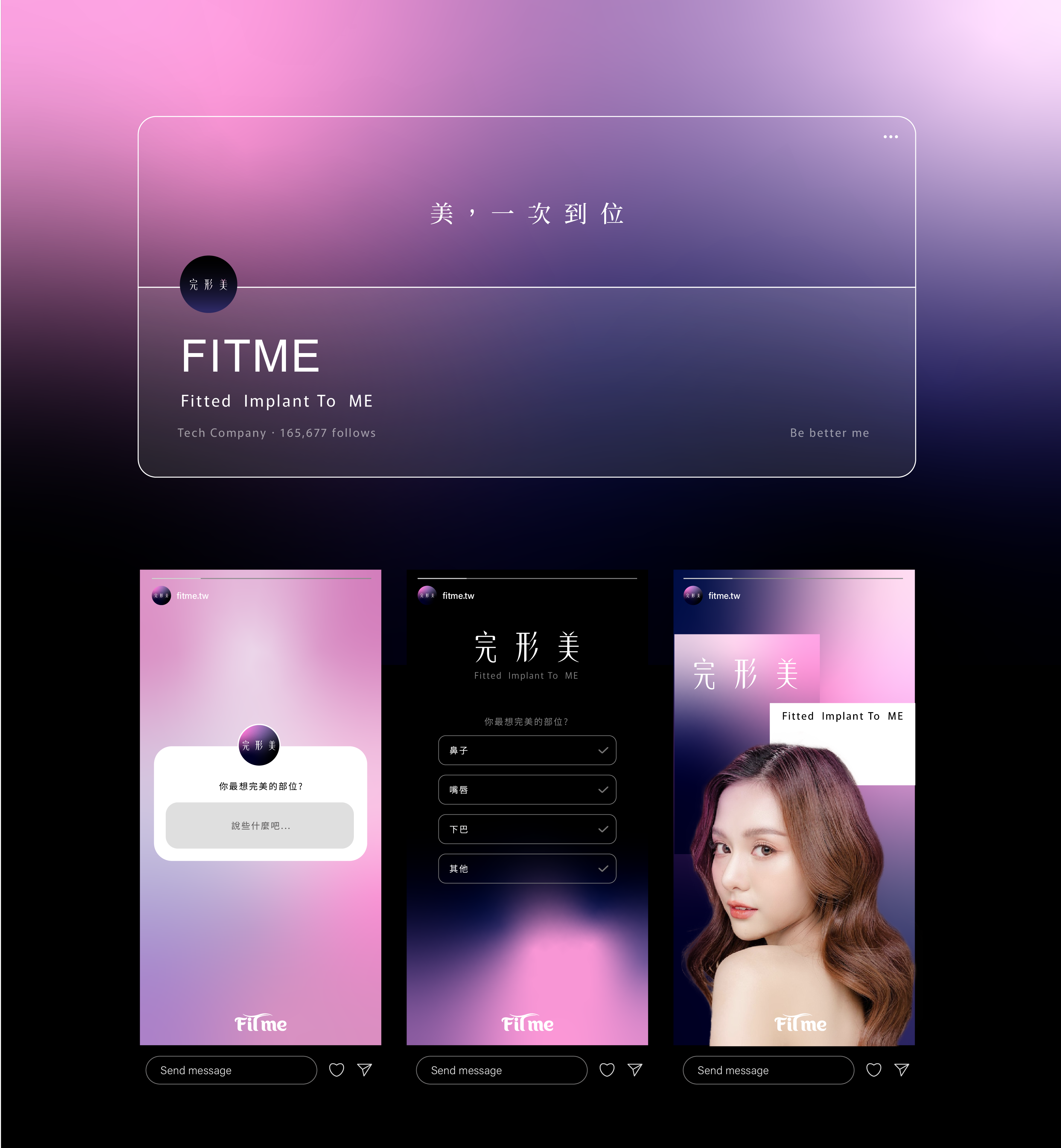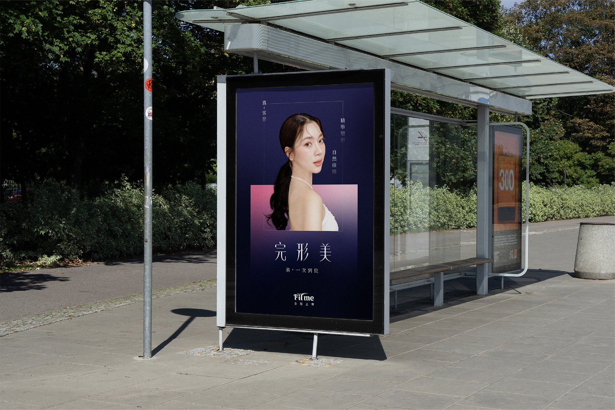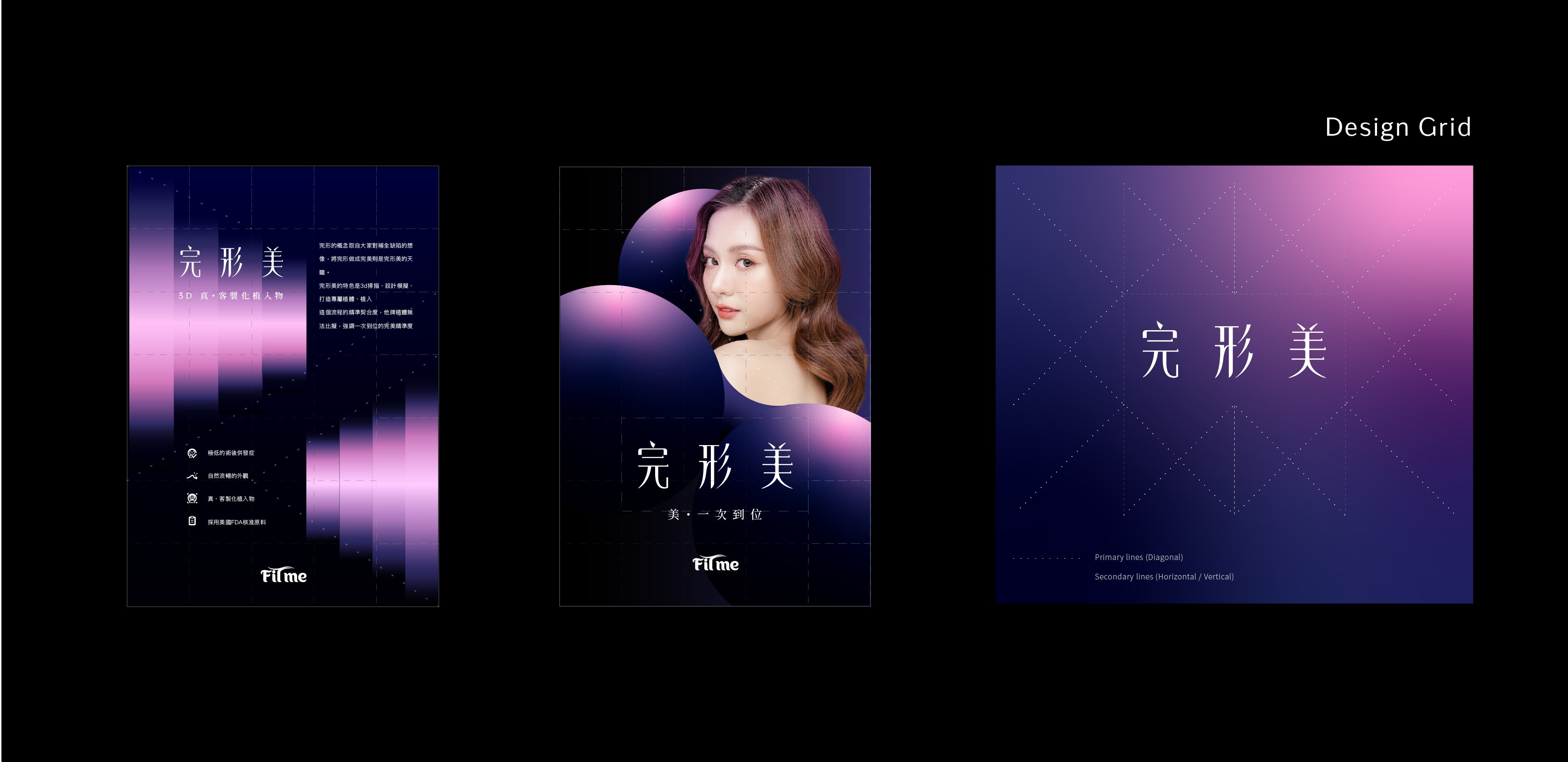 理解Fitme的科研技術背景基礎,以及品牌致力於透過卓越3D科技推動醫美植體的進步,以精準的手術流程,補全患者的缺陷。 我們結合完形的概念與Fitme的讀音,將完形變為完美的過程。於是品牌在地命名為『完形美』。 基於全新的概念思維,品牌提出全新標語『美,一次到位』。完形美不僅補全患者缺陷,同時也打造出與同業差異的品質關鍵。 品牌的形象設計同時加入的優美曲線與科技質感,高挑優雅的字體滿足患者對完美的想像,低調奢華的科技感在完形美的文化中不斷擴散,科技與時尚並存的魅力姿態,確保完形美在臉部植體的技術領導地位。