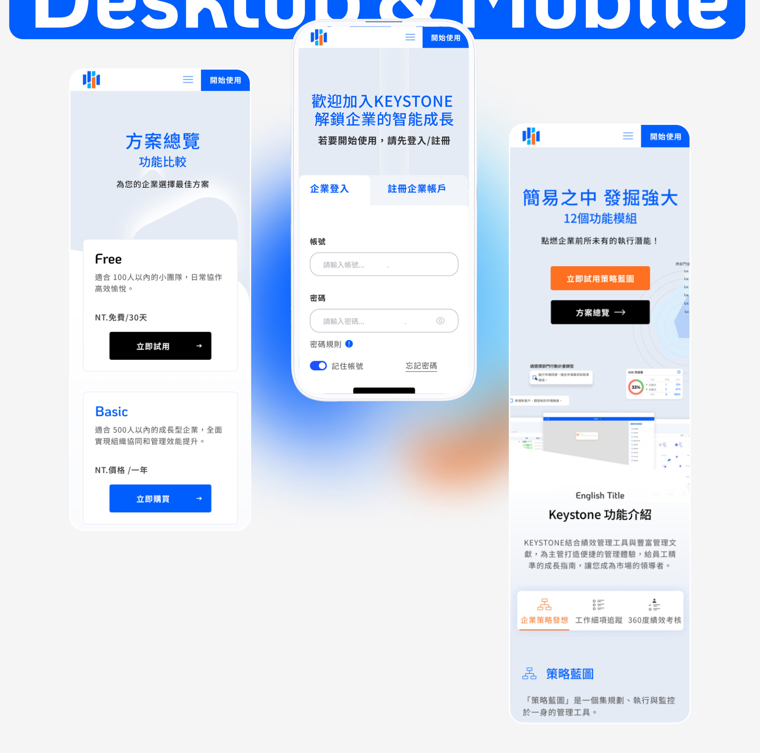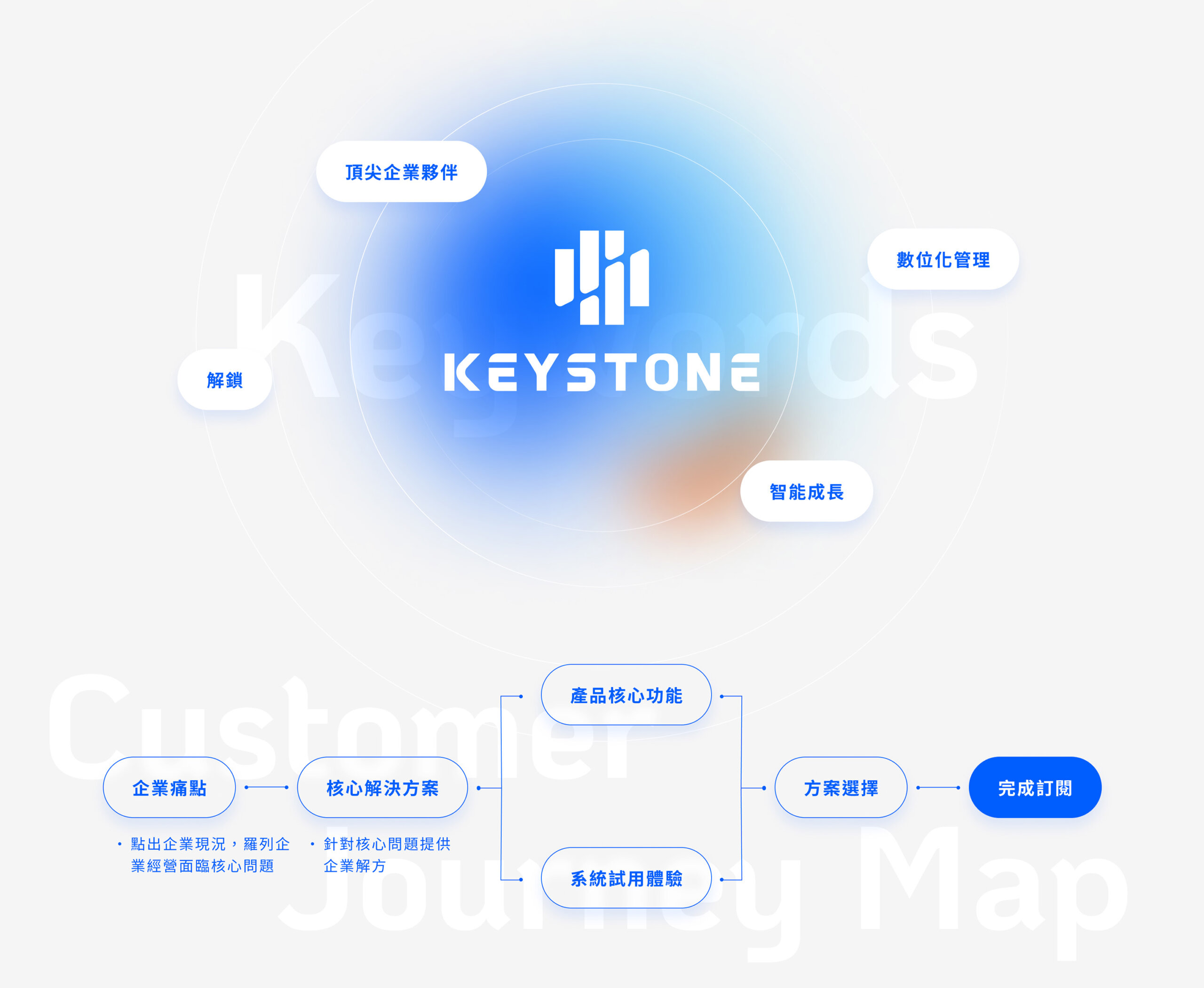 『Be The Best Mentor - 解鎖企業的智能成長』 在品牌定位的前期,我們深入分析 Keystone 如何協助企業解決經營管理上的痛點,並提供相應的解決方案。透過數據化分析不同類型的人才能力,Keystone 能夠給予企業精準的決策建議。因此,我們為其打造了清晰易懂的品牌標語,使其成為企業認識 Keystone 的敲門磚,激發對產品的興趣。