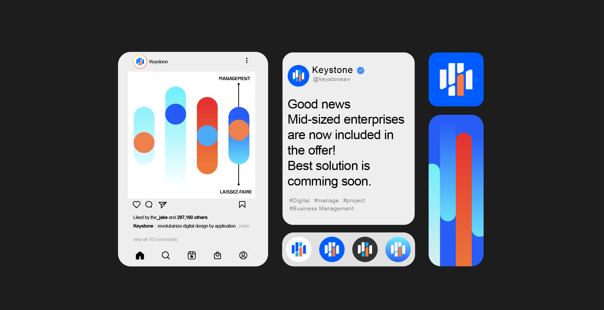Keystone管理大師在數位管理的變革躍進上不遺餘力,白質將通透的設計語彙導入視野的變化體驗,透過不斷變化的形象讓使用者產生更輕易引導案件的使用感受。 充滿現代感的塊狀貫穿在所有品牌識別,讓企業主在變革之中,選擇了更活潑充滿魅力的前景,透過有意義的設計,充分運用不同物品傳達品牌概念。