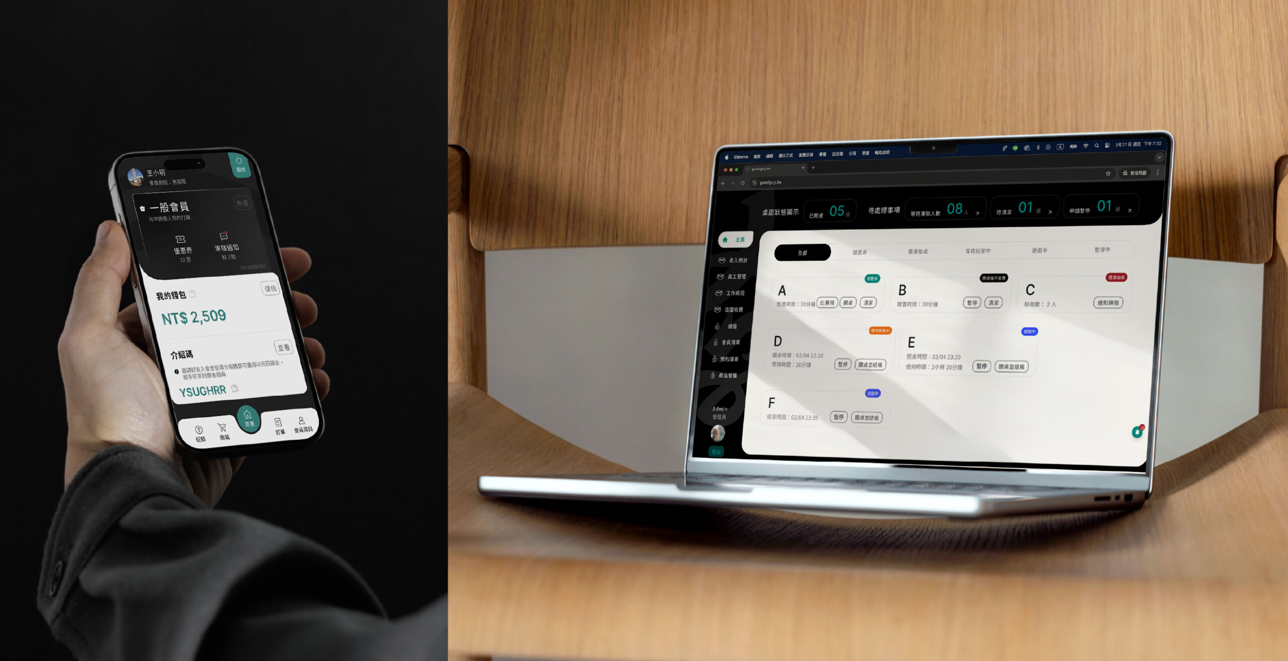 我們這次在品牌的規劃的過程中,除了對外的市場形象與對內的核心定位外,也以此延伸規劃了新型態麻將館的運營模式,包含帶入儲值消費的概念以及湊桌共遊的服務。同時我們也負責本次全店面運營系統的開發,包含了會員系統的建置、與電動麻將桌連動的iot系統開發、遊戲制度的落實到金流與員工管理的全方位設計。 這次的系統開發分為顧客端與品牌端,顧客端主要使用手機應用程式進行進店的所有操作,品牌店員端則是透過後台系統可以安排會員入桌遊戲、店面所有開關以及訂單系統的所有功能。品牌營運端則能夠透過這個系統取得店面運作的所有數據資料,包含會員數據、開關桌時間、店員工作數據、營運金流數據...等。