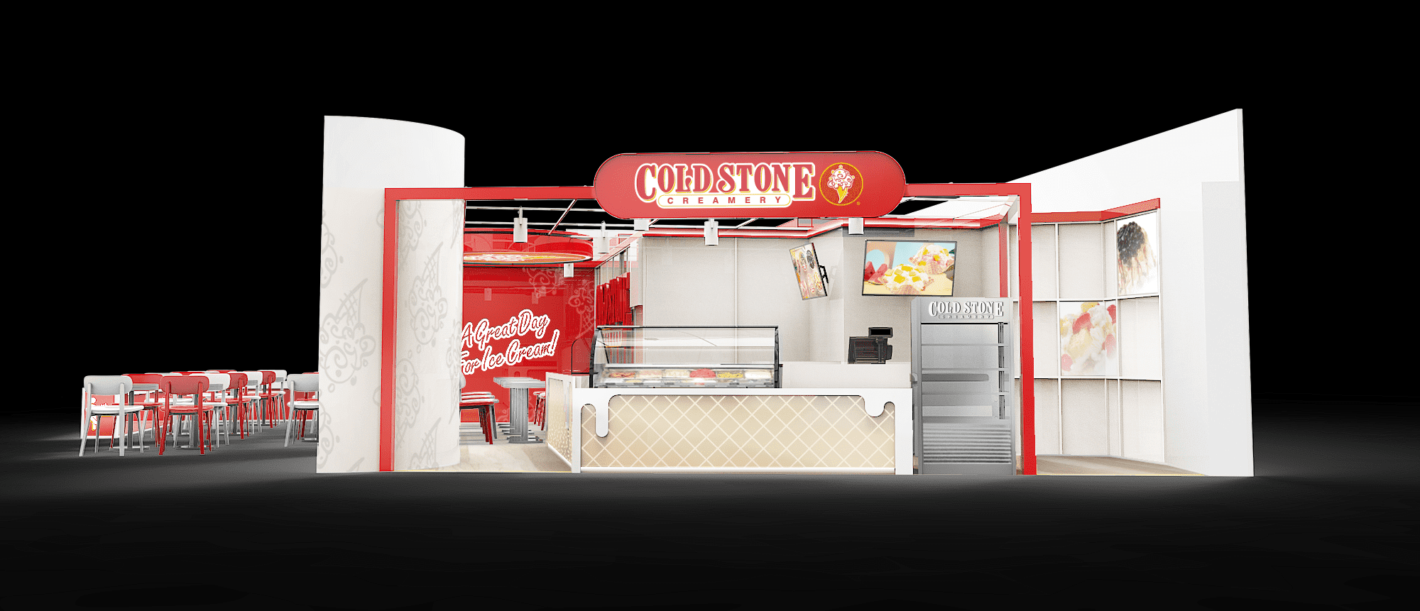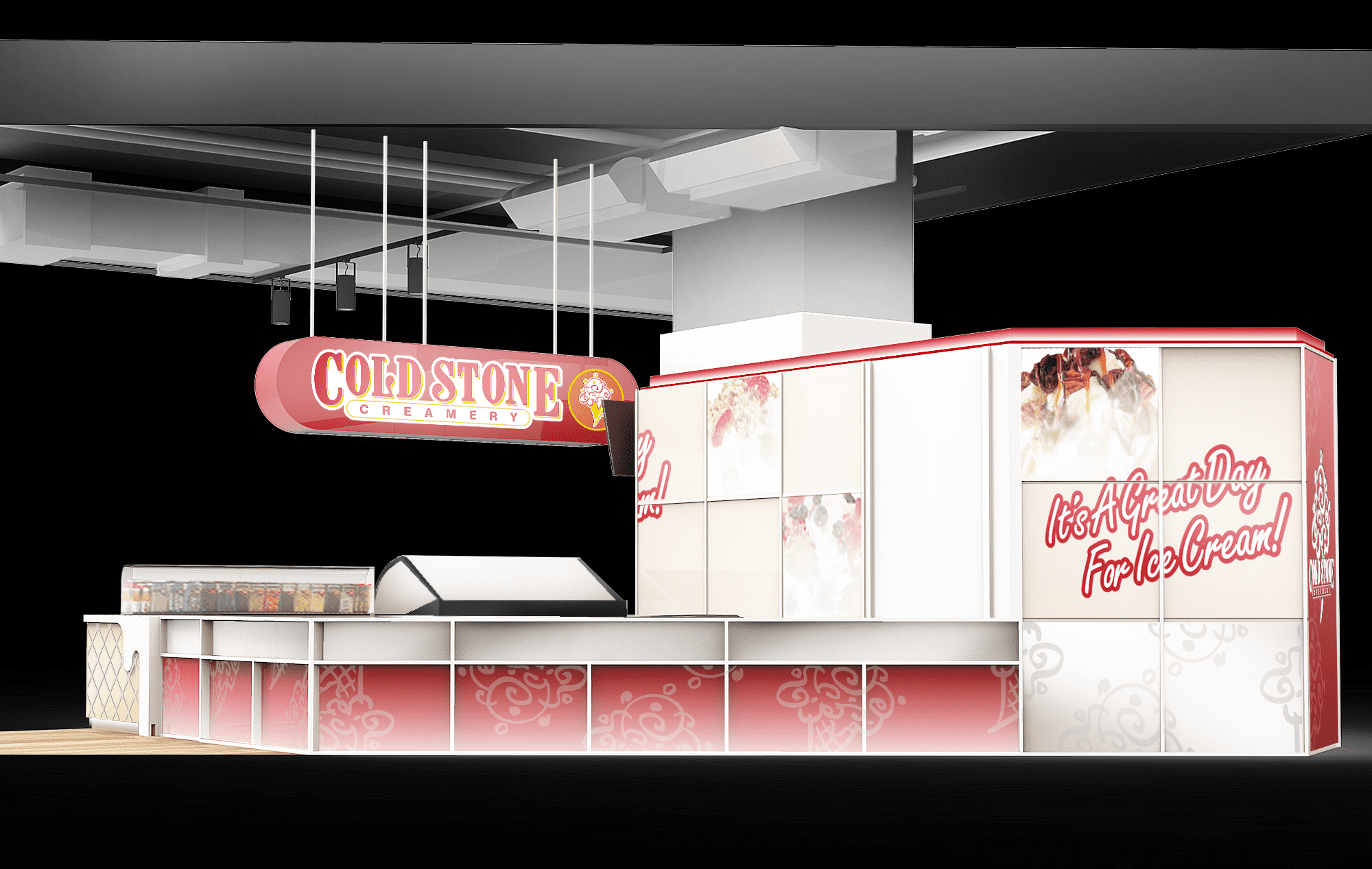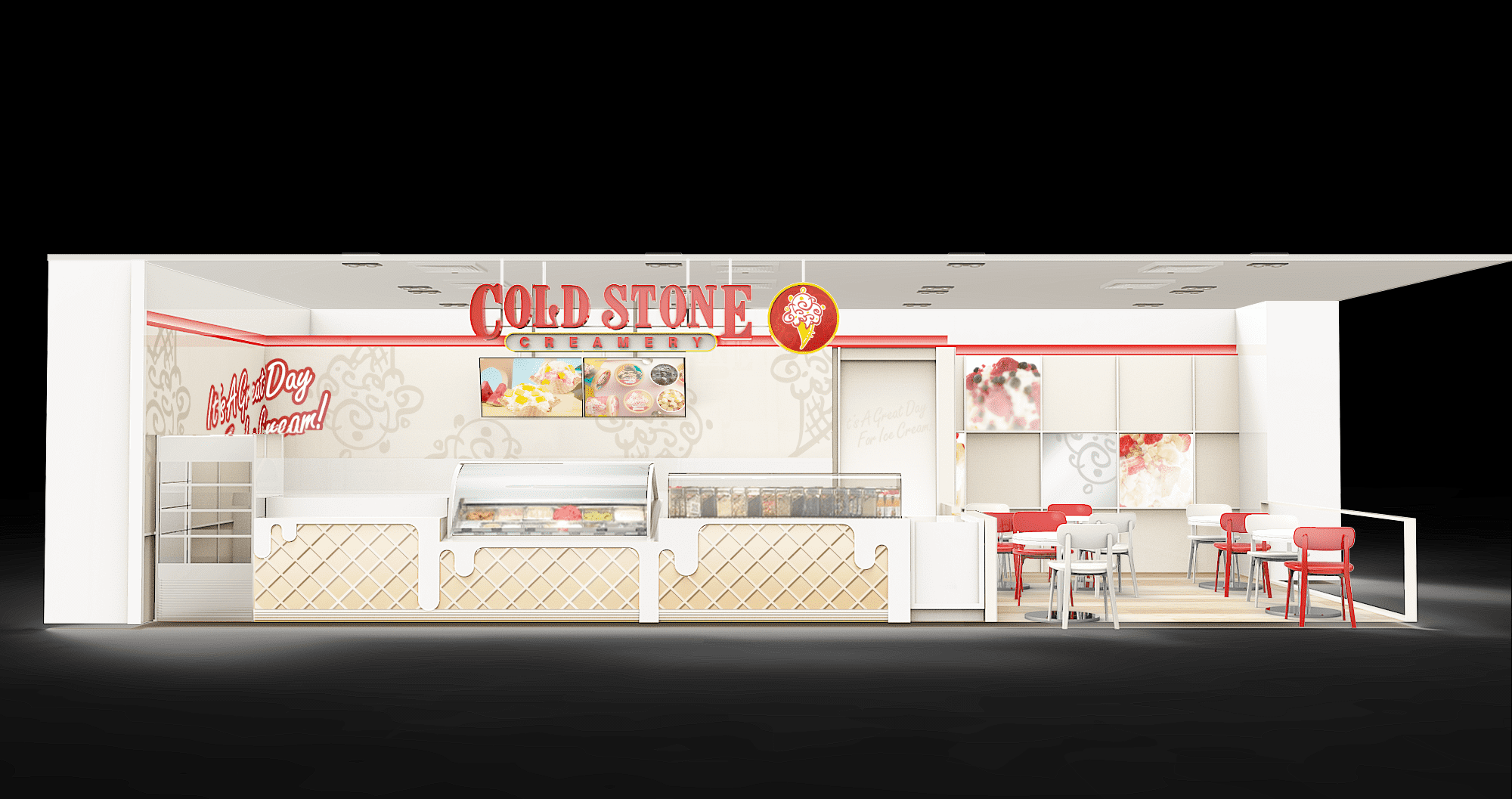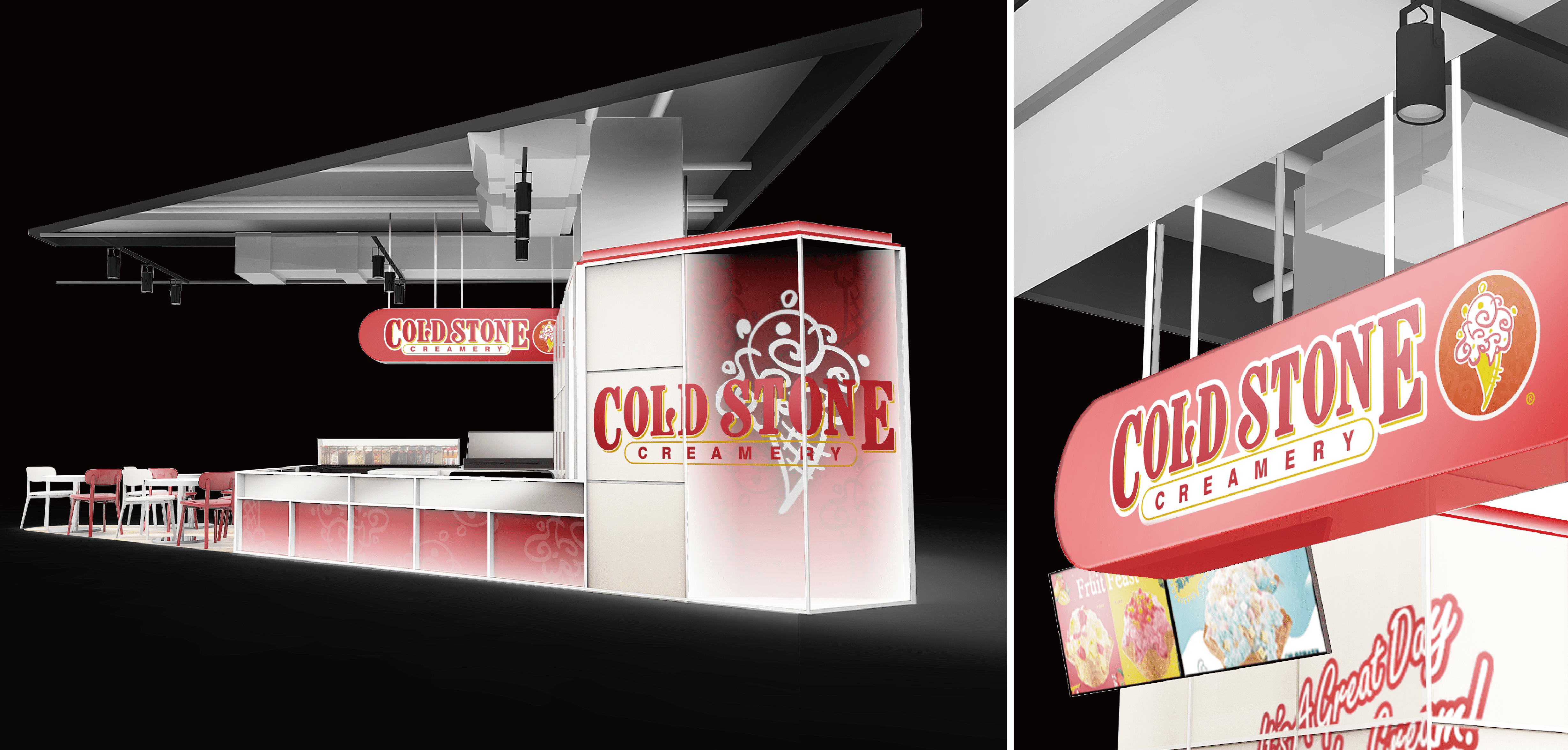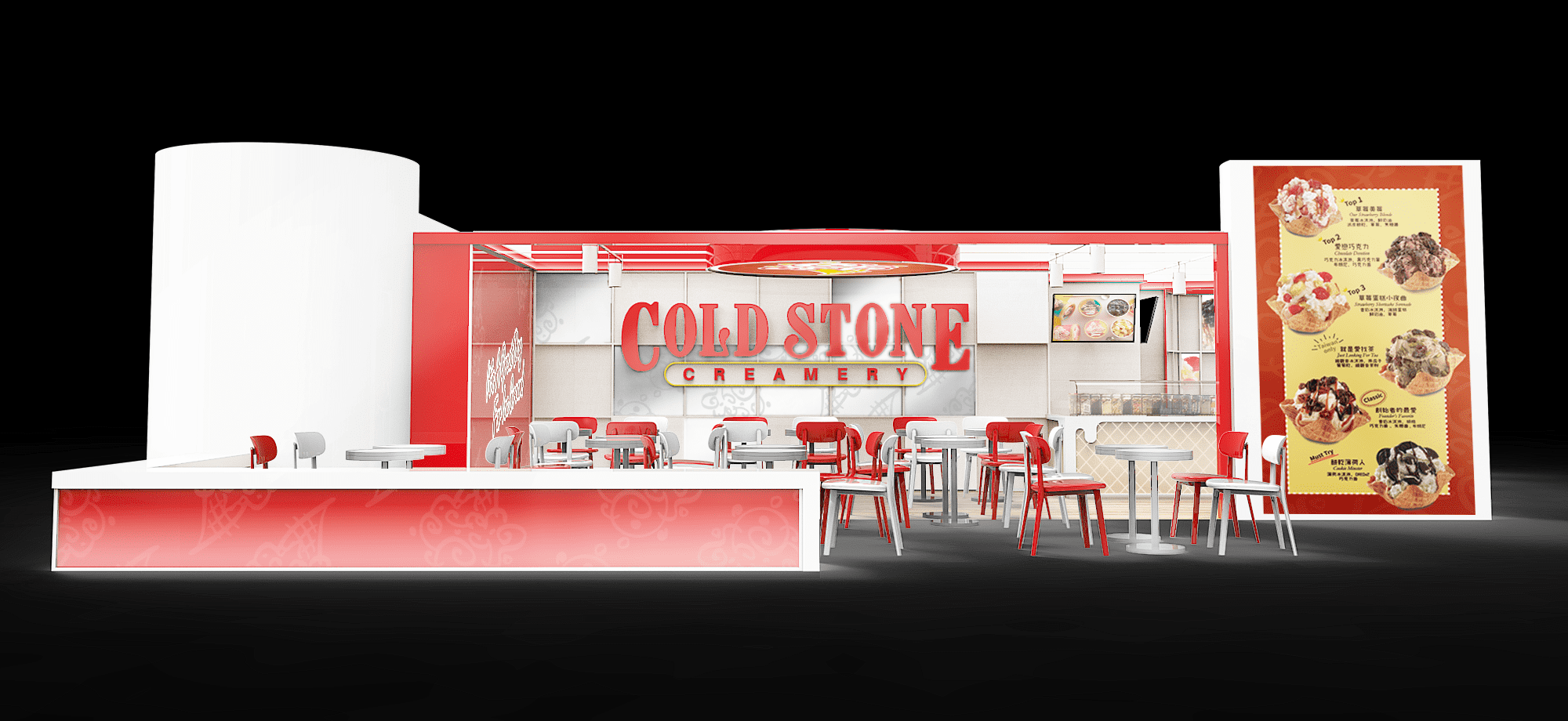 酷聖石座落於各大百貨賣場,多年來提供消費者香甜可口的冰淇淋,是推車買家眼中的綠洲。 在酷聖石的店面改版規範上,我們聚焦在加強商品、品牌意象,並且透過色彩比例加強店面的亮度,加強門市辨識性。 在pattern的使用方面,我們運用玻璃、亮彩、打霧面材分別在不同的細節上表現品牌元素,餅乾紋路櫃檯則透過透明面材的厚度對比做出仿立體呈現,品牌的紅色也調整為線形表現,運用品牌色彩勾勒門市輪廓。